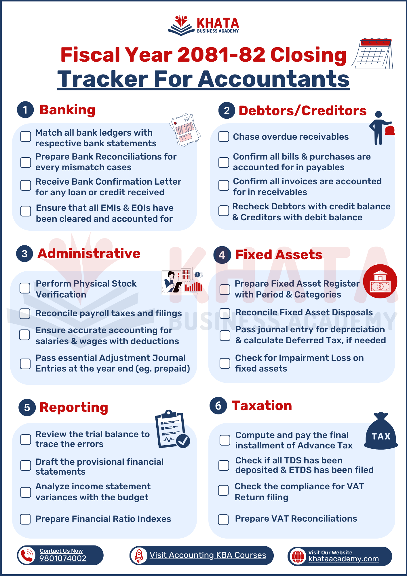 To help you through this critical task, Khata Business Academy put together a simple yet through checklist. It covers everything from bank reconciliations and inventory checks to final tax calculations. Each point is designed to be straightforward and easy to understand, ensuring you can close the year confidently and without confusion. Here’s a straightforward guide to handling each key area effectively: